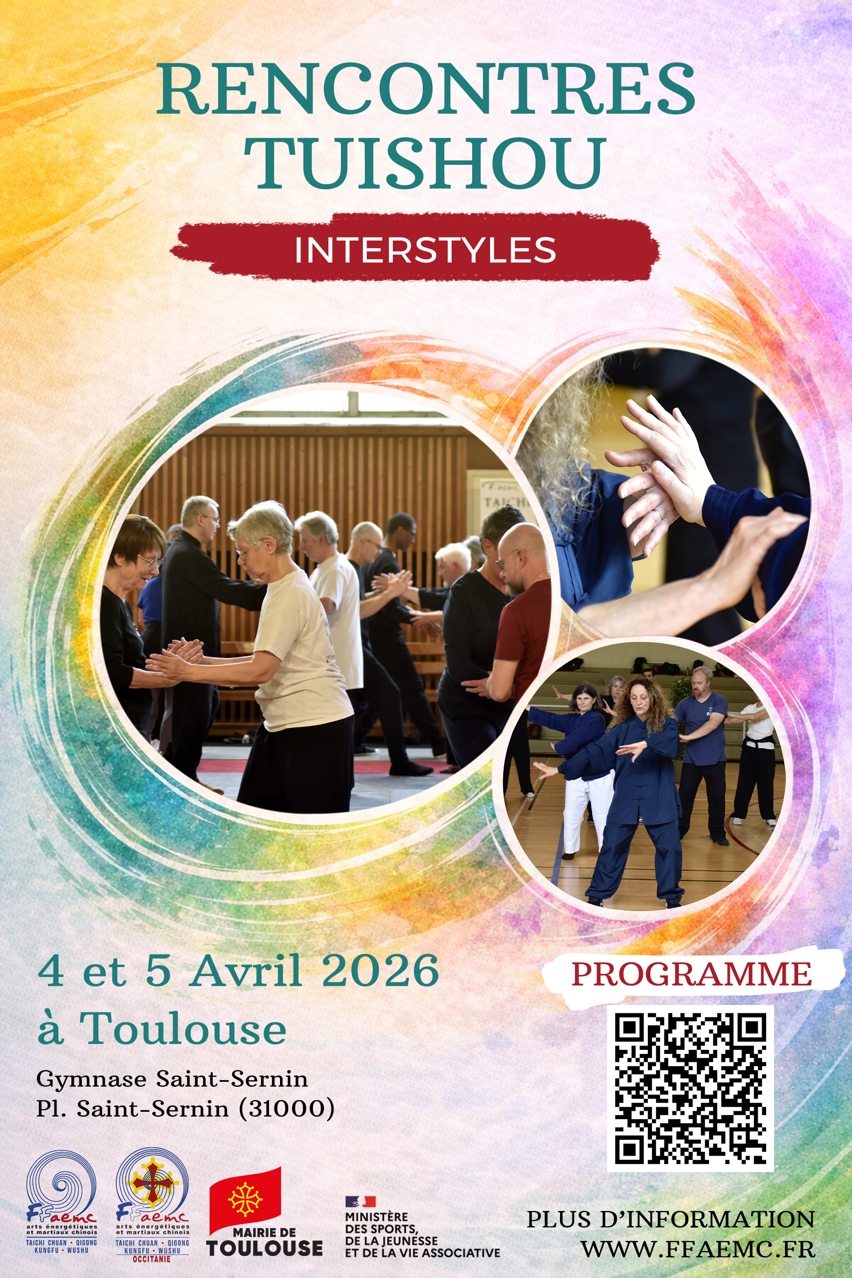 La Fédération Française des Arts Energétiques et Martiaux Chinois en collaboration avec le comité régional Occitanie, organise sa nouvelle édition de l’évènement Tuishou Interstyles les 4 et 5 Avril 2026 pour la première fois à Toulouse, au coeur de la ville rose, dans le quartier historique de Saint Sernin (gymnase St Sernin). Venez découvrir ou approfondir cette pratique à deux du Tai Chi Chuan, de la poussée des mains (Tuishou) animé par un collectif d’enseignants diplômés de la Fédération FFAEMC. Ateliers de pratique, démonstrations, conférence table ronde…